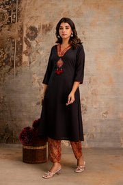 Elegant Black Pure Cotton Kurta Set with Hand & Lace Work Neckline – Aaronee Ethnic Wear
